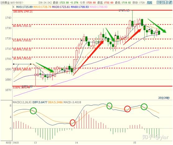上图为黄金1小时走势图,昨日黄金大幅走高,刷新2012年以来新高至1747后回落,同时MACD出现“死叉”看